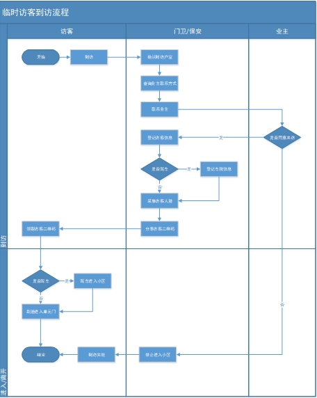 支持业主/访客人脸预约。支持在物业APP进行访客临时登记,用于临时访客来访登记使用。临时访客来访需到门卫或保安处使用物业APP进行访客信息登记,由保安核实访客信息并经由业主同意来访后,可对访客进行放行。